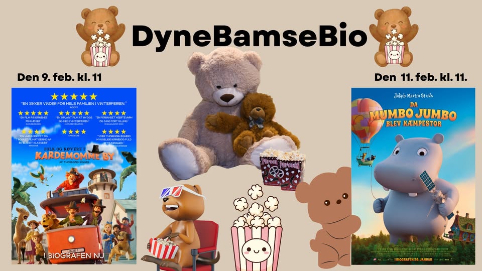 Tag din dyne og din blødeste bamse🧸 med til en hyggelig formiddag for de mindste 💛 Vi blænder endnu engang op for vores populære DyneBamseBio, hvor bamserne skal prøve, om de kan sidde stille og se en god film – og måske eeelsker din bamse🧸også dejlige lune popcorn 🍿😉
